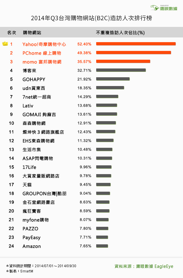 今年第三季最受歡迎的 B2C 購物網站排行榜出爐!台灣最大的電商數據分析平台 EagleEye 公佈第三季 B2C 網站排行榜,以「不重複造訪人次」為排行標準,Yahoo 奇摩購物中心,在今年六月宣佈調整以行動商務虛實整合的完全通路模式來打開電商產值,第三季的到訪人次以超過 50%的佔比名列第一。才剛宣佈與騰訊商店街合作、推出「支付連‧財付通」付款服務來邁向大陸市場的「PChome線上購物」則緊追在後,而積極經營跨境電商、剛宣佈 APP 超過十萬下載的momo富邦購物網,也以亮眼成績排名第三。