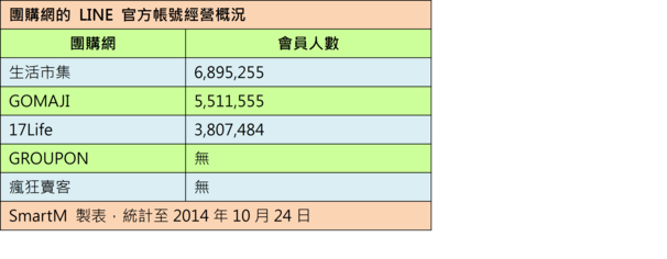 SmartM 在「2014年第一季台灣Top30購物網站造訪排行榜出爐」一文中曾提及,各家團購網能否在行動購物的布局勝出,將是未來致勝的關鍵。在行動購物布局上,生活市集、GOMAJI、17Life均加入LINE官方帳號的行銷,會員人數以生活市集領先,三家擁有LINE官方帳號的團購網,除了在中午12點於LINE強力推播優惠訊息之外,17Life有每月兩次的 ON AIR 推播功能,GOMAJI則單純推播「文字+連結」的優惠訊息給消費者。
